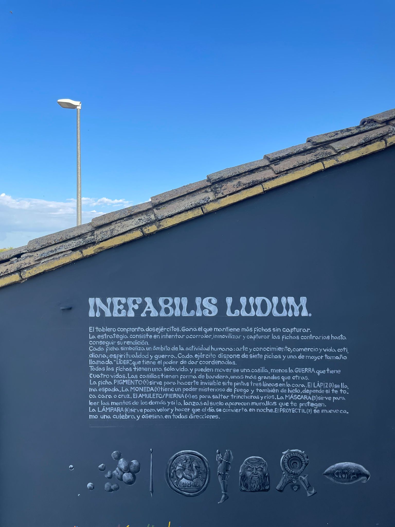 ‘INEFABILIS LUDUM’ es un juego inventado en colaboración con los alumnos y las alumnas de 5º de Primaria del colegio La Cabañeta, en El Burgo de Ebro. El propio centro escolar toma su denominación de un yacimiento homónimo a orillas del río Ebro. En esta ubicación se encontró una ‘tabula lusoria’ (tablero de juego) grabada en una losa que había pertenecido a algún templo y que fue descubierta por el equipo de arqueólogos del yacimiento y que sirvió de tapa de alcantarilla.