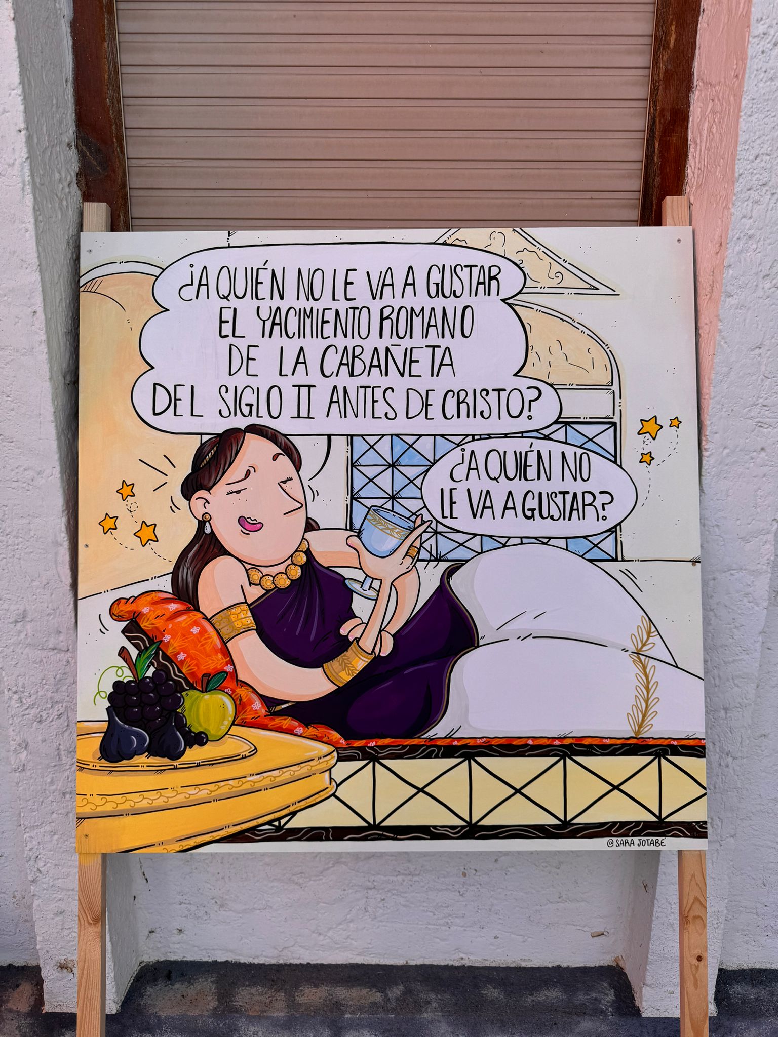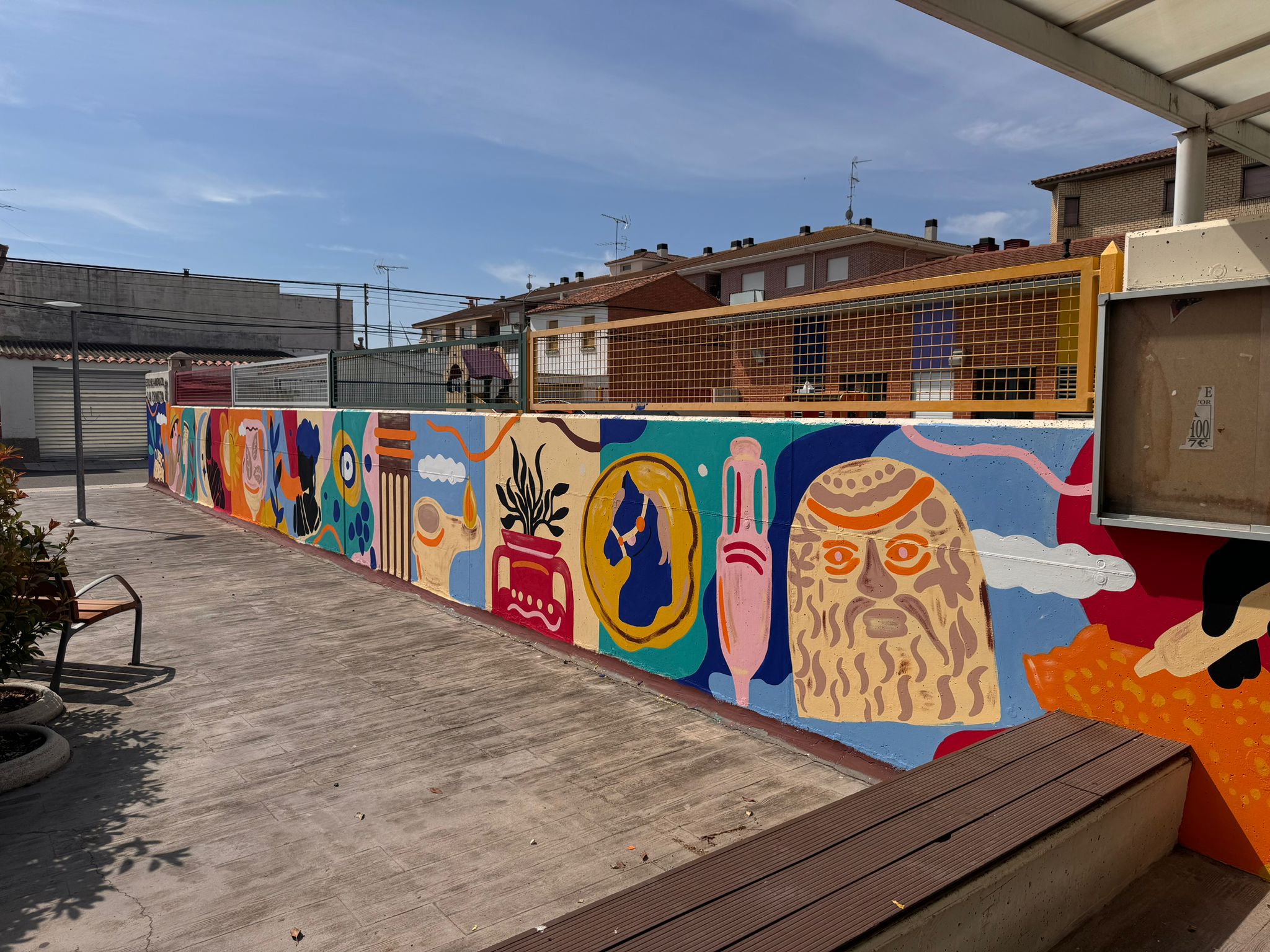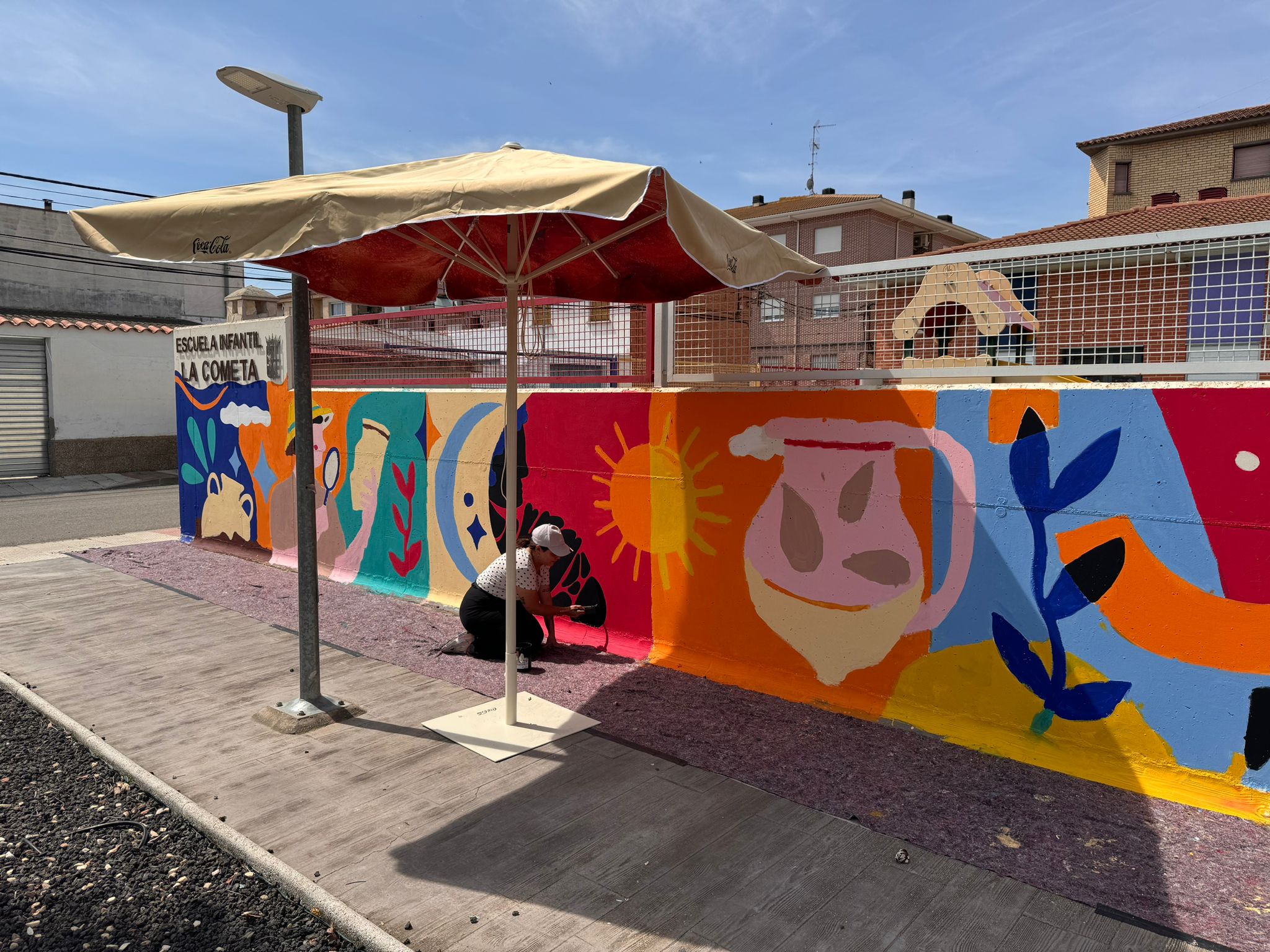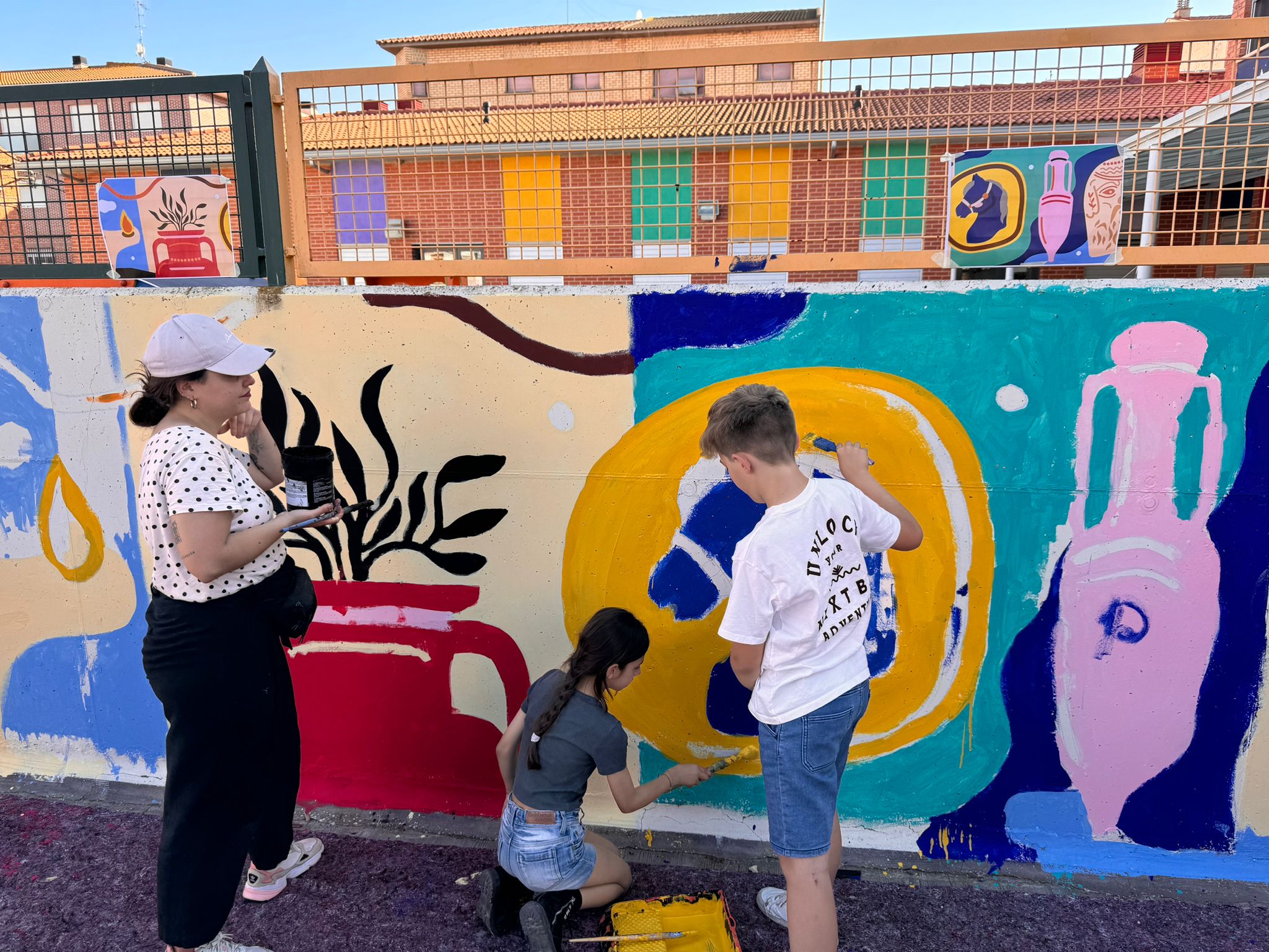 La jornada del sábado tuvo como uno de los principales puntos de interés la Escuela Municipal Infantil La Cometa, en cuya tapia exterior se llevó a cabo, bajo la dirección de la artista Laura Alloza y con la ayuda del alumnado del CPI La Cabañeta, un mural que tuvo como inspiración al propio yacimiento.